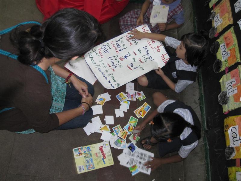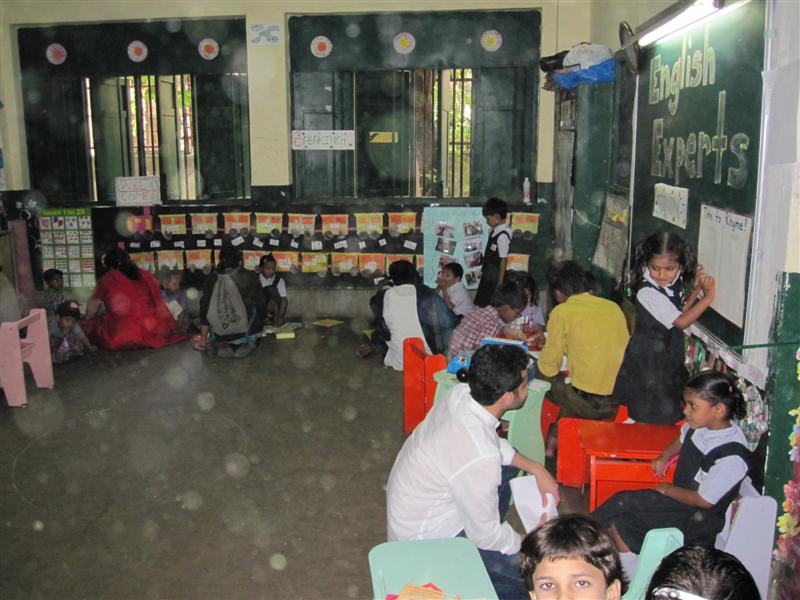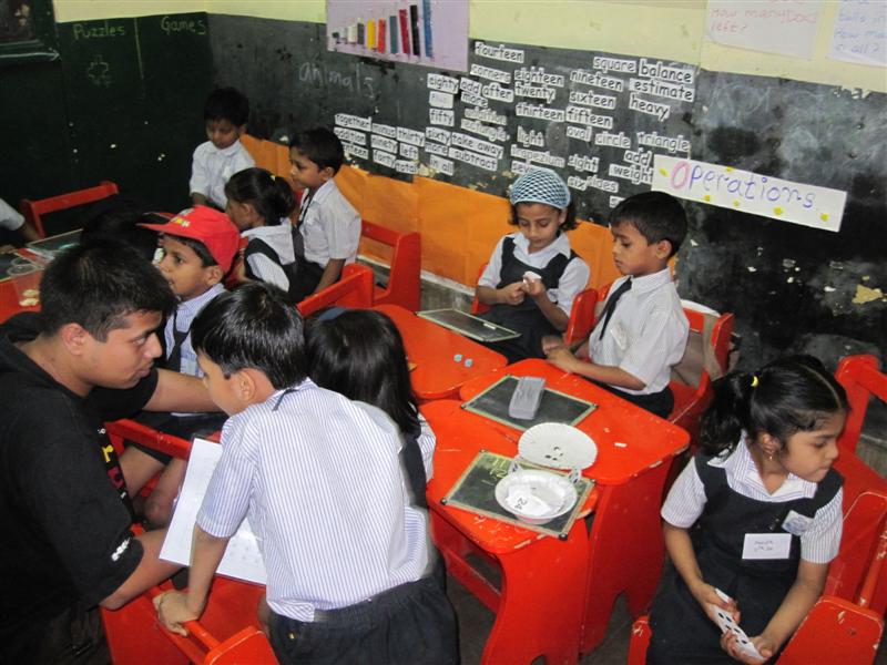 The math room had a number of hands on activities to introduce the children to basic numeracy concepts from counting to addition and subtraction. The walls were festooned with their handiwork and with brightly illustrated graphs and signs. Sitting among the kids was Yash, one of the student teachers. Yash is typical of a new batch of motivated teaching crew that helps Akanksha. He is a graduate of the prestigious Indian Institute of Technology, Bombay – the MIT of India. He was at Akanksha as part of the new Teach for India program. As part of the program he spends his time teaching kids the wonders of mathematics. It was a joy to see the enthusiasm and energy in his little protégés as he engaged them in various math challenges and games.